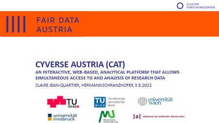 Im Rahmen der Webinarreihe im Projekt FAIR Data Austria wurde ein Webinar zum Thema CyVerse Austria (CAT) organisiert, das am 3.5.2022 stattfand.